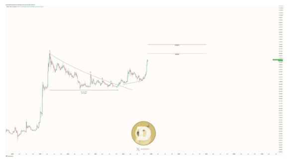 El analista de criptomonedas Javon Marks también confirmó que un repunte al ATH actual para el precio de Dogecoin estaba a la vista. En una publicación de X, dijo que Dogecoin estaba subiendo hacia los 0,6533 dólares y podría superar ese nivel una vez que alcanzara el objetivo. Añadió que este aumento del precio del 52,2% a 0,6533 dólares podría ocurrir rápidamente y que un repunte a 1,25 dólares entra en juego una vez que eso suceda.