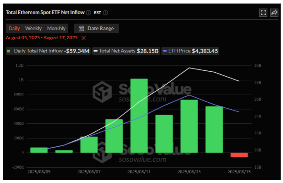 El optimismo en torno al rally de Ethereum se enfrió justo cuando la semana llegó a su fin. En particular, los ETF de ETH al contado con sede en EE. UU. informaron salidas netas de $59.34 millones el 15 de agosto, lo que puso fin a una racha de ocho días que había agregado $3.7 mil millones en entradas.