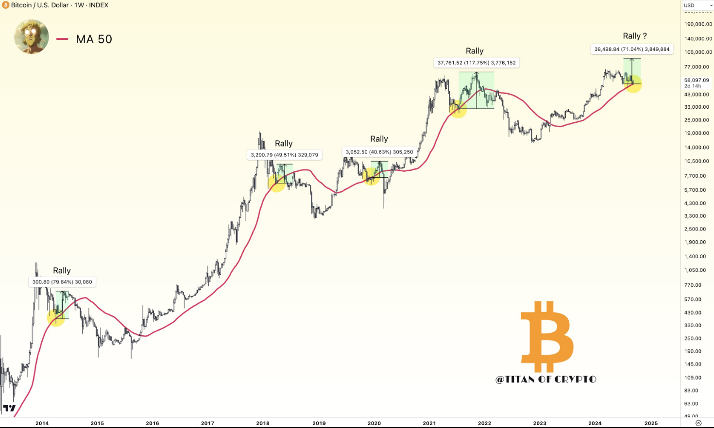 En ciclos anteriores, cuando el precio volvió a probar el promedio móvil simple de 50 semanas 🔴, rebotó al menos un 40%.