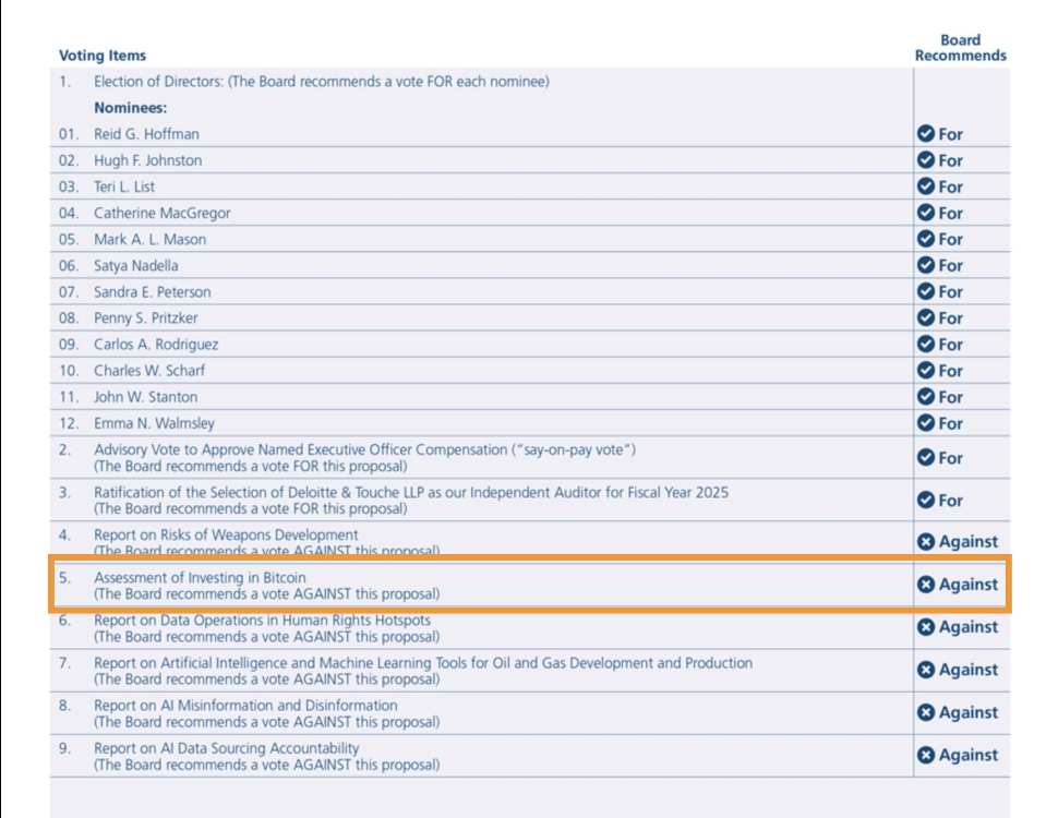 La junta de Microsoft, por otro lado, quiere que los accionistas voten en contra de este plan porque la compañía ya ha analizado una amplia gama de activos invertibles, incluidas las criptomonedas.