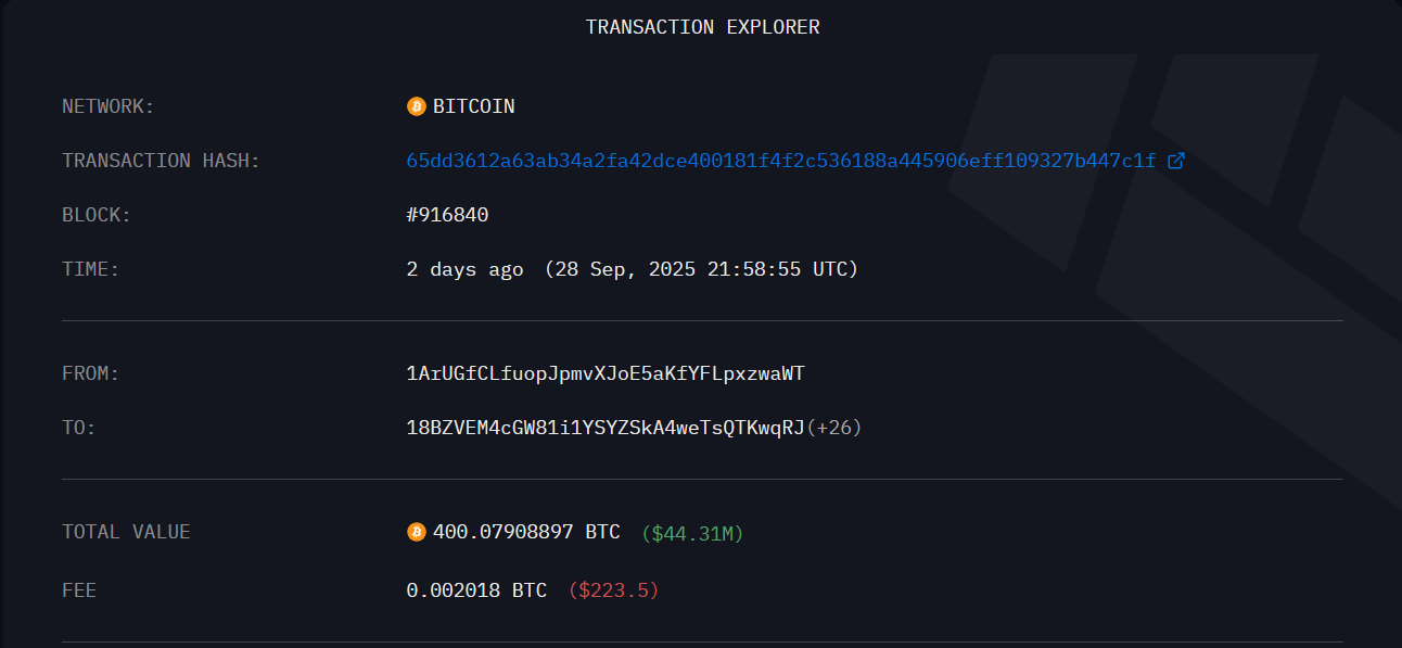 Una billetera de Bitcoin que había permanecido en silencio durante mucho tiempo despertó esta semana y vació aproximadamente 400 BTC en varias direcciones nuevas. Según los rastreadores de blockchain, la dirección envió sus monedas en múltiples transacciones, principalmente divididas en lotes de 15 BTC. El valor total movido es de aproximadamente $44 millones, según los precios actuales.