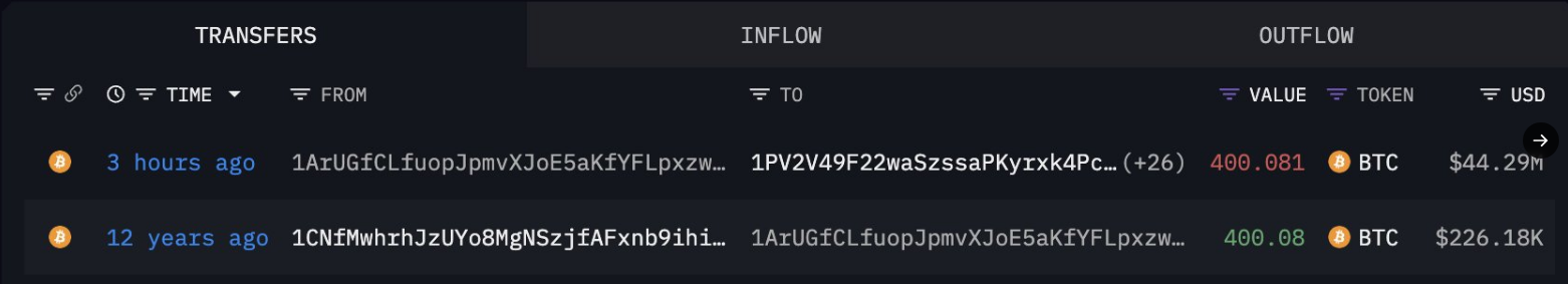 Una billetera inactiva despertó después de 12 años, moviendo 400.08 $BTC($44.29M) a múltiples billeteras nuevas hace 3 horas.