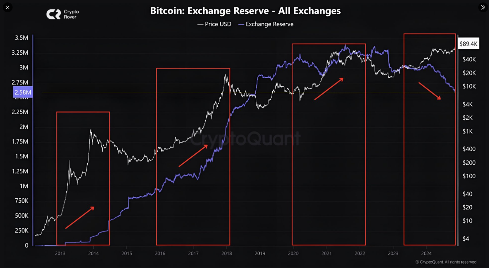 La disminución constante de las reservas de Bitcoin en los exchanges es una de las tendencias más notables identificadas por Crypto Rover. A pesar del precio creciente de Bitcoin, un número creciente de inversores están transfiriendo sus tenencias a billeteras privadas.