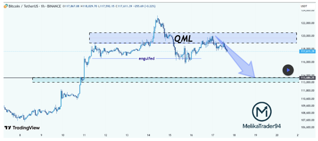 According to the hourly candlestick chart shared by Melikatrader94, Bitcoin is currently exhibiting a Quasimodo Level (QML) structure. The Quasimodo Level (QML) structure is characterized by three peaks in a bearish scenario or three troughs in a bullish scenario, with the middle one being the most prominent, identifying the price. The post predicted that Bitcoin’s entry into the $119,000–$121,000 zone would draw sellers, and this was indeed the case.