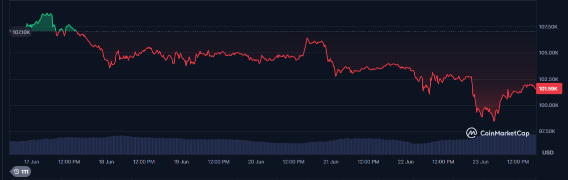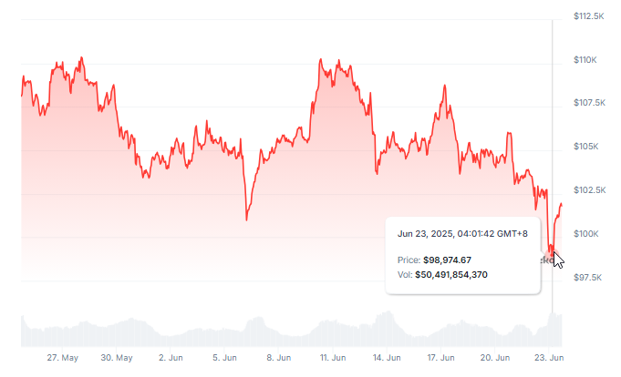 Bitcoin bajó brevemente a $98,974(https://www.coingecko.com/en/coins/bitcoin) el domingo por la noche después de que ataques aéreos estadounidenses atacaran instalaciones nucleares iraníes. Ese fue su punto más débil desde principios de mayo.
