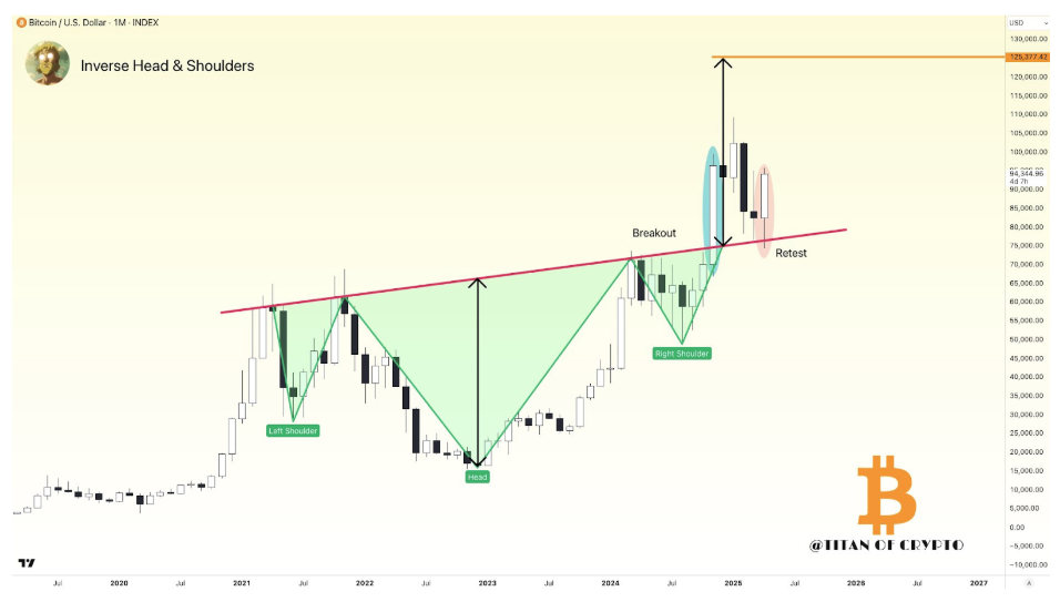 Este objetivo se deriva de un patrón masivo de Cabeza y Hombros Invertidos (H&I) identificado en el gráfico de velas mensuales de Bitcoin.