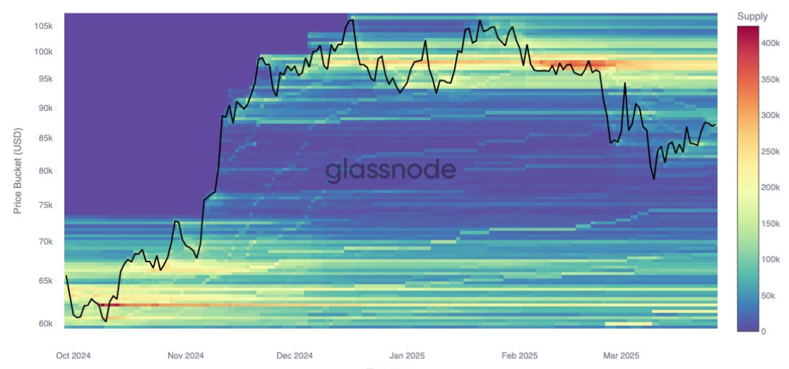 A medida que el soporte continúa subiendo gradualmente, la resistencia parece estar fortaleciéndose cerca de la marca de $95,000. Los datos de la base de costos de los inversores muestran un aumento de 12,000 BTC agrupados en este nivel desde el 24 de marzo.