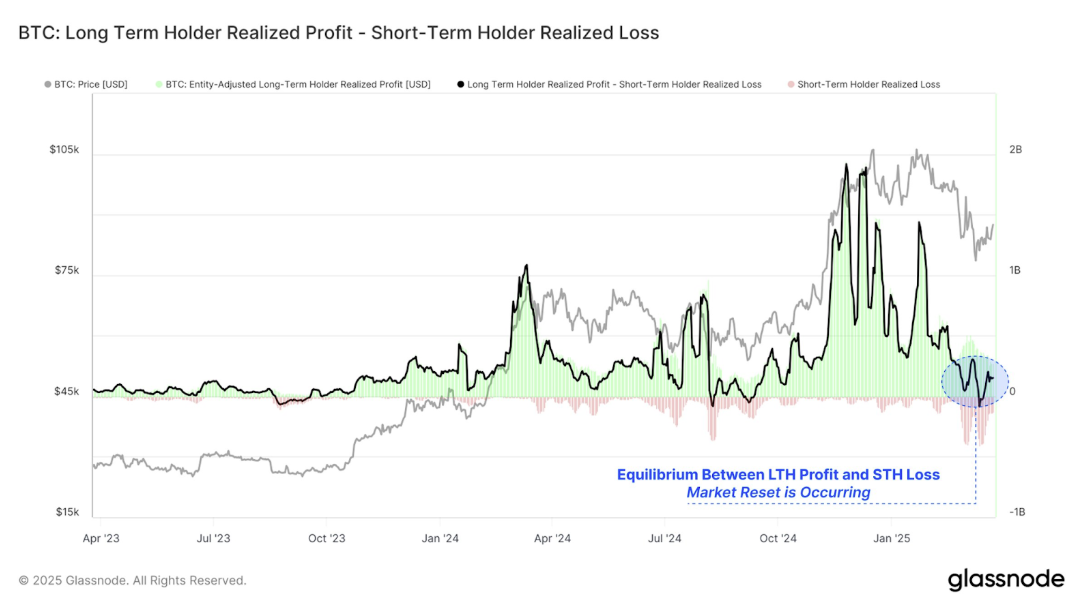 Los datos de Glassnode confirman que los tenedores a largo plazo (direcciones que mantienen Bitcoin durante más de 150 días) han sido la principal fuente de toma de ganancias durante un tiempo. La toma de ganancias de los tenedores a largo plazo ahora casi coincide con las pérdidas sufridas por los operadores a corto plazo que han mantenido Bitcoin durante menos de 155 días.