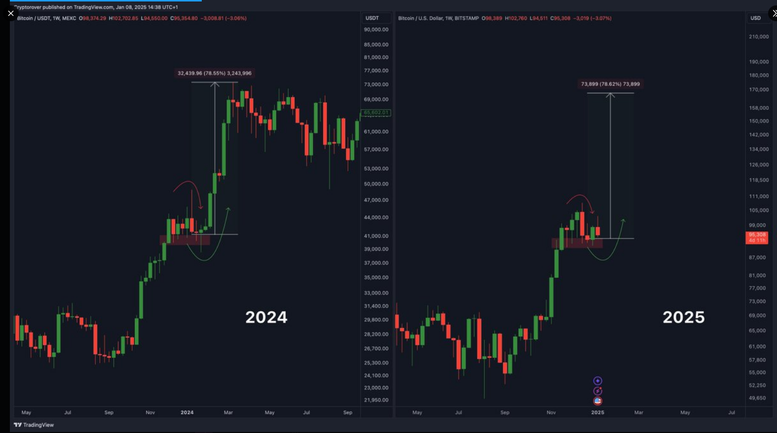 En medio de esta incertidumbre, el reconocido analista de criptomonedas Crypto Rover ha expresado una perspectiva alcista para Bitcoin. Recientemente comparó la acción del precio de hoy con patrones históricos, lo que sugiere que enero podría ver tendencias positivas para Bitcoin.