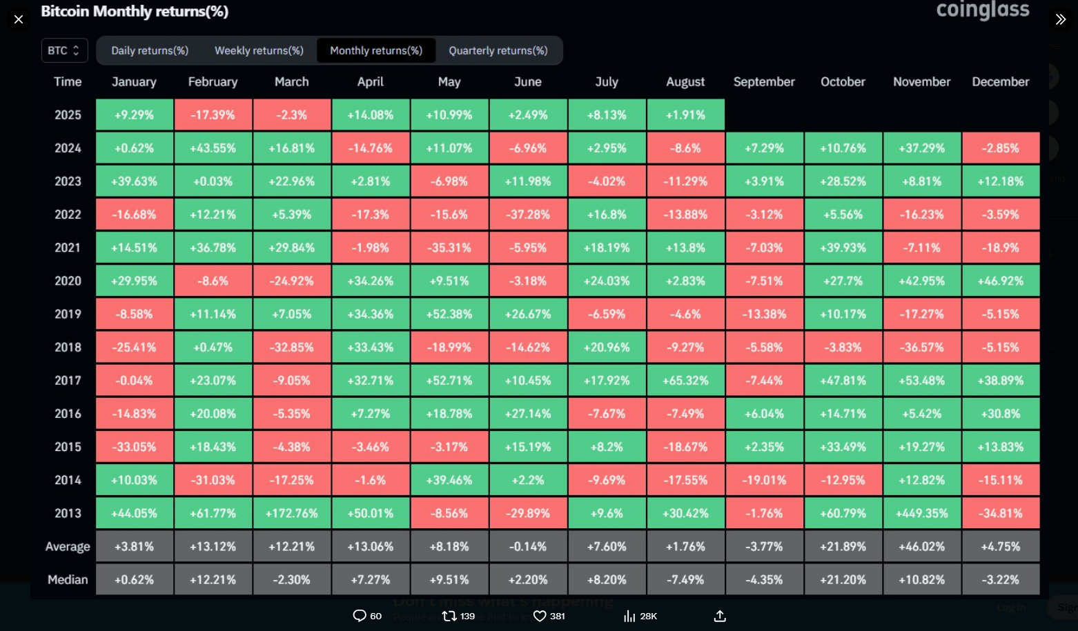 Nunca en la historia, BTC ha visto un agosto y septiembre verdes. Solemos ver una rápida liquidación seguida de un Q4 explosivo en… pic.twitter.com/cClxJUG6Vh