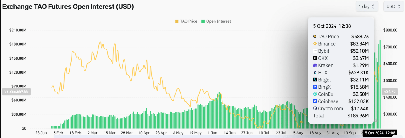 Según Coinglass, el interés abierto de TAO, que recientemente alcanzó un máximo histórico de $189 millones, es uno de los indicadores más reveladores de su fortaleza. Eso es un fuerte aumento desde los $50 millones registrados a principios de septiembre. Un interés abierto creciente, que es el número total de posiciones activas mantenidas por los operadores, suele ser una señal muy positiva, ya que indica que se está invirtiendo más dinero en el activo.