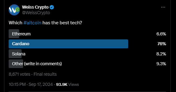 Curiosamente, Cardano recibió un fuerte voto de confianza de la comunidad criptográfica. En una encuesta reciente realizada por Weiss Crypto, ADA ganó el título de altcoin con la mejor tecnología, recibiendo más del 76% de los votos. Esto demuestra que, a pesar de las dificultades de precios, la comunidad aún cree en el potencial a largo plazo de Cardano.