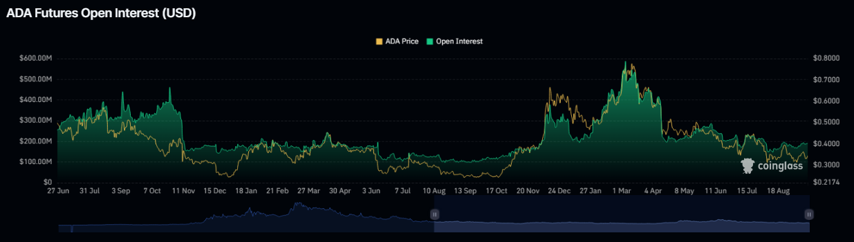 ADA no ha podido salir de su rango actual incluso con las estadísticas optimistas en cadena. El precio de la altcoin se mantiene fijo cerca de $0.33 incluso con la esperanza mostrada en la relación largo/corto y el creciente interés abierto de futuros. El estado de ánimo pesimista del mercado de criptomonedas más amplio, que ha deprimido su desempeño a corto plazo, puede ayudar a explicar este estancamiento.
