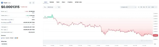 BYTE se disparó a 0,0 5 5486 dólares, un aumento significativo desde su caída a 0,0 5 4916 dólares el 19 de agosto, pero ahora está experimentando una pérdida del 8,71% en las últimas 24 horas. De manera similar, TOSHI experimentó una disminución del 4,94%, mientras que MOCHI perdió un 13,19%.