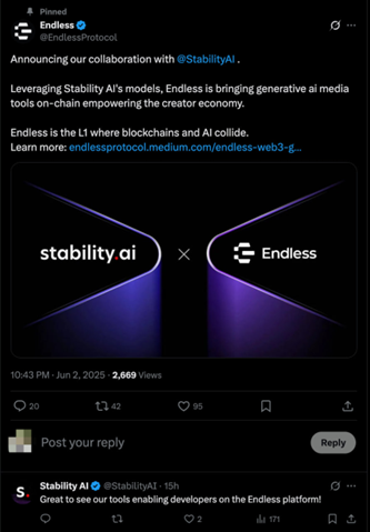 Desde su lanzamiento de la red principal en marzo de 2025, Endless ha acelerado el desarrollo de productos y la expansión del ecosistema a través de asociaciones con Alibaba Cloud y la Universidad de Surrey. En abril de 2025, presentó un fondo para desarrolladores de $1 millón para impulsar la innovación en IA y la adopción de Web2 a Web3, atrayendo múltiples proyectos. En Token 2049 en Dubai, Endless lanzó su libro blanco de IA, que describe la integración de IA-Web3. Su colaboración con Stability AI marcó un paso significativo hacia un ecosistema descentralizado y centrado en los creadores.