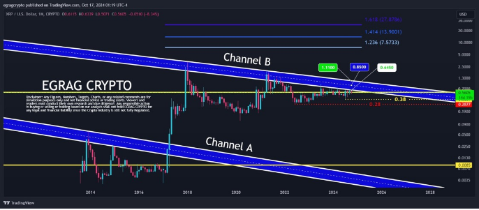 Una ruptura significativa desde el nivel de $0,6450 podría indicar un impulso potencial alcista, pero aún permanecería dentro de los límites del Canal B. El segundo objetivo de precio, $0,85, es un objetivo clave que el precio de XRP también ha luchado por mantener a lo largo de los años. También representa un rango medio de todo el Canal B XRP.