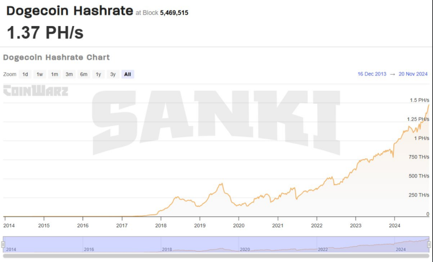 Dogecoin está en racha y su red disfruta de números sólidos. Prueba de ello es su creciente tasa de hash, que alcanzó un máximo histórico. Esto fortalece la seguridad y estabilidad de la cadena de bloques, además de ser más atractivo para los mineros e inversores.