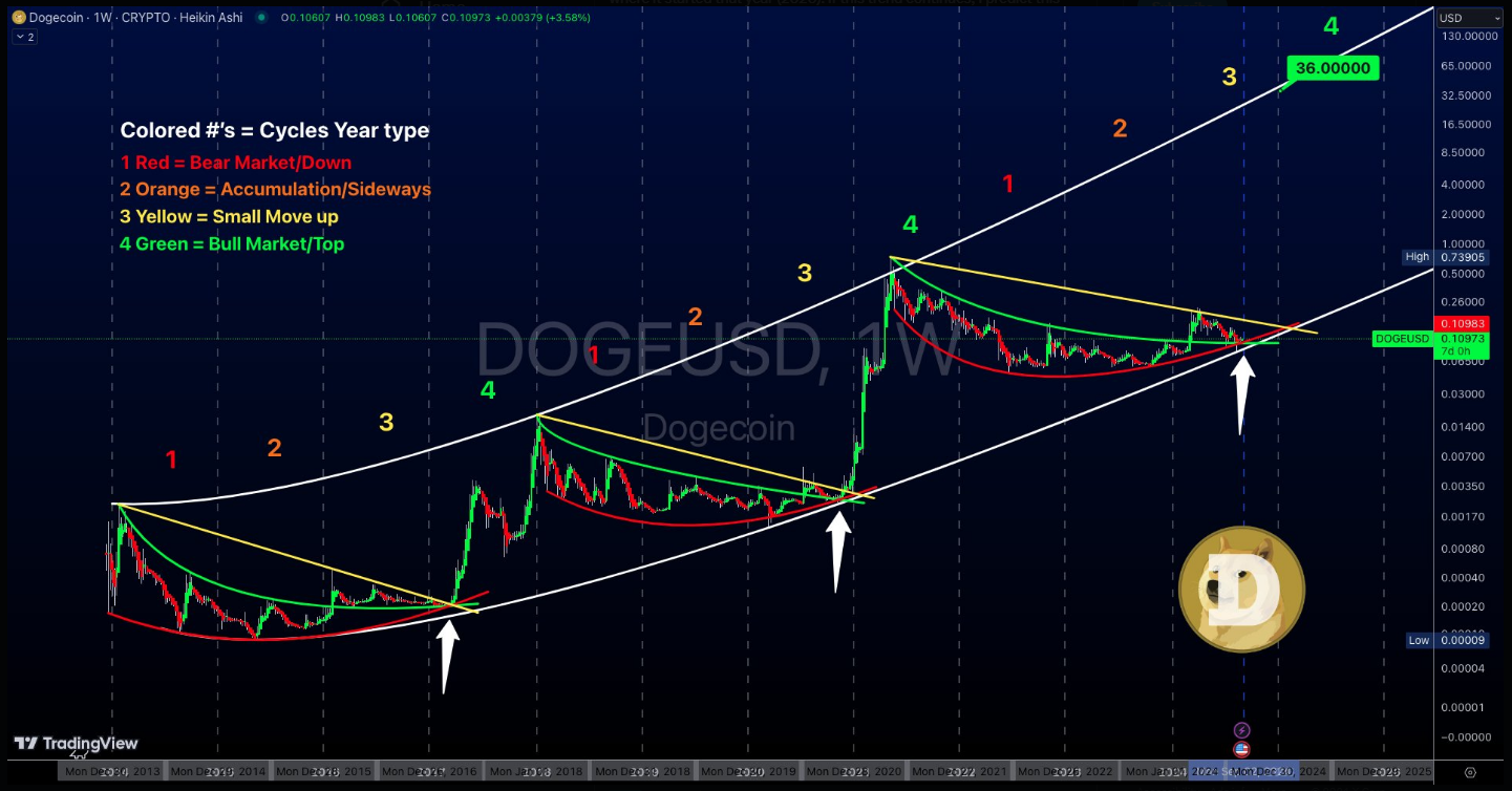 También hay razones para el optimismo que surgen de la naturaleza cíclica del aumento de precio de Dogecoin. Recientemente, los analistas han notado que DOGE tiene una fuerte subida de precio cada tres años.