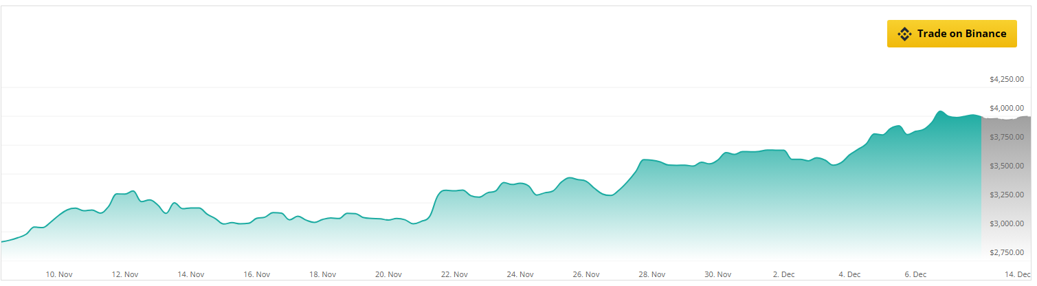 El comportamiento reciente de los precios de Ethereum también ha sido bastante favorable. Después de un pequeño revés, la altcoin se ha recuperado, subiendo un 30% a partir del 18 de noviembre. Con los analistas destacando su resistencia a las oscilaciones del mercado, se cotiza actualmente a $ 3.686, una cifra sólida.