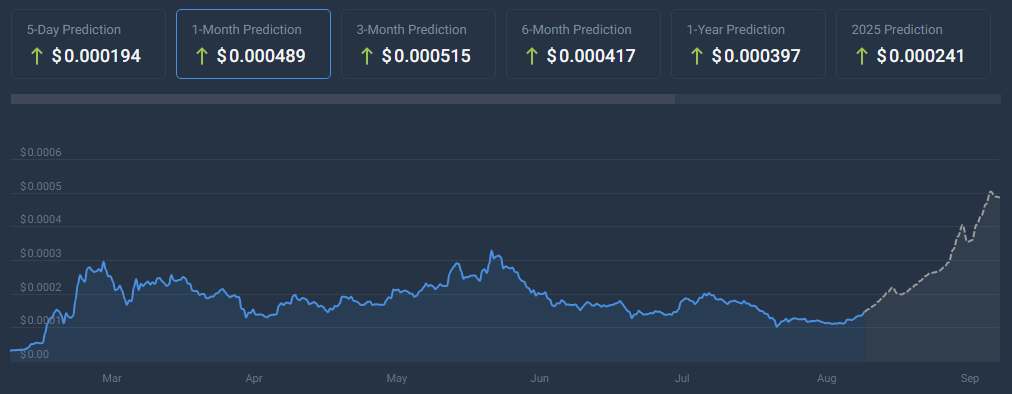 Mirando más allá, la previsión de precios de FLOKI parece bastante prometedora. Según CoinCodex, el precio podría aumentar aproximadamente un 227% para el 22 de septiembre de 2024, lo que implica que podría llegar a 0,000489 dólares.