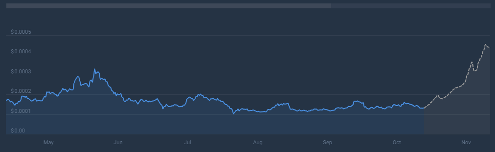 En vista de estos mensajes contradictorios, los inversores deberían seguir siendo extremadamente cautelosos. Dado que el futuro inmediato parece difícil, muchas predicciones indican que habrá una tendencia alcista y los inversores pueden alcanzar un precio que podría llegar a USD 0,00044 a fines de noviembre. Sin embargo, muchos operadores se muestran escépticos dado el sentimiento actual.