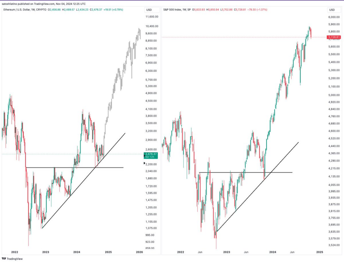 Basándose en el desempeño reciente del S&P 500, él cree que esta alineación indica que ETH se está preparando para una ruptura similar. Martínez cree que ETH podría seguir una trayectoria similar, quizás alcanzando la elusiva marca de 10.000 dólares, ya que el S&P 500 se hundió un poco después de su avance a aproximadamente 5.900 dólares.