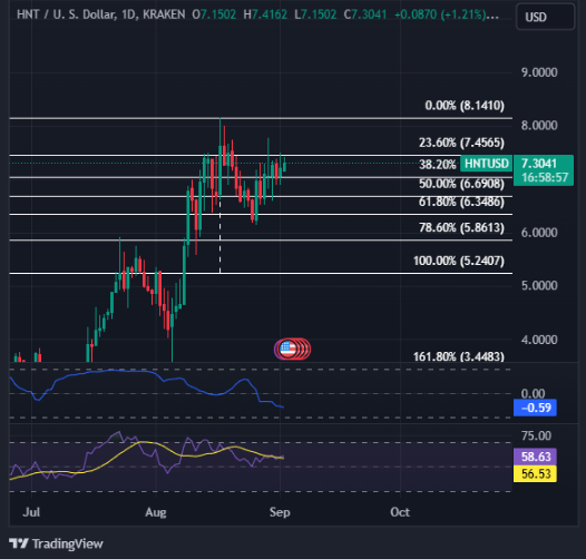 HNT se estabilizará entre un rango de negociación de 7 a 7,4 dólares, lo que dejará tanto a los alcistas como a los bajistas con poco margen de maniobra. El índice de fuerza relativa (RSI) mediocre del token abre la oportunidad para que los alcistas creen impulso en el rango de negociación actual de HNT.