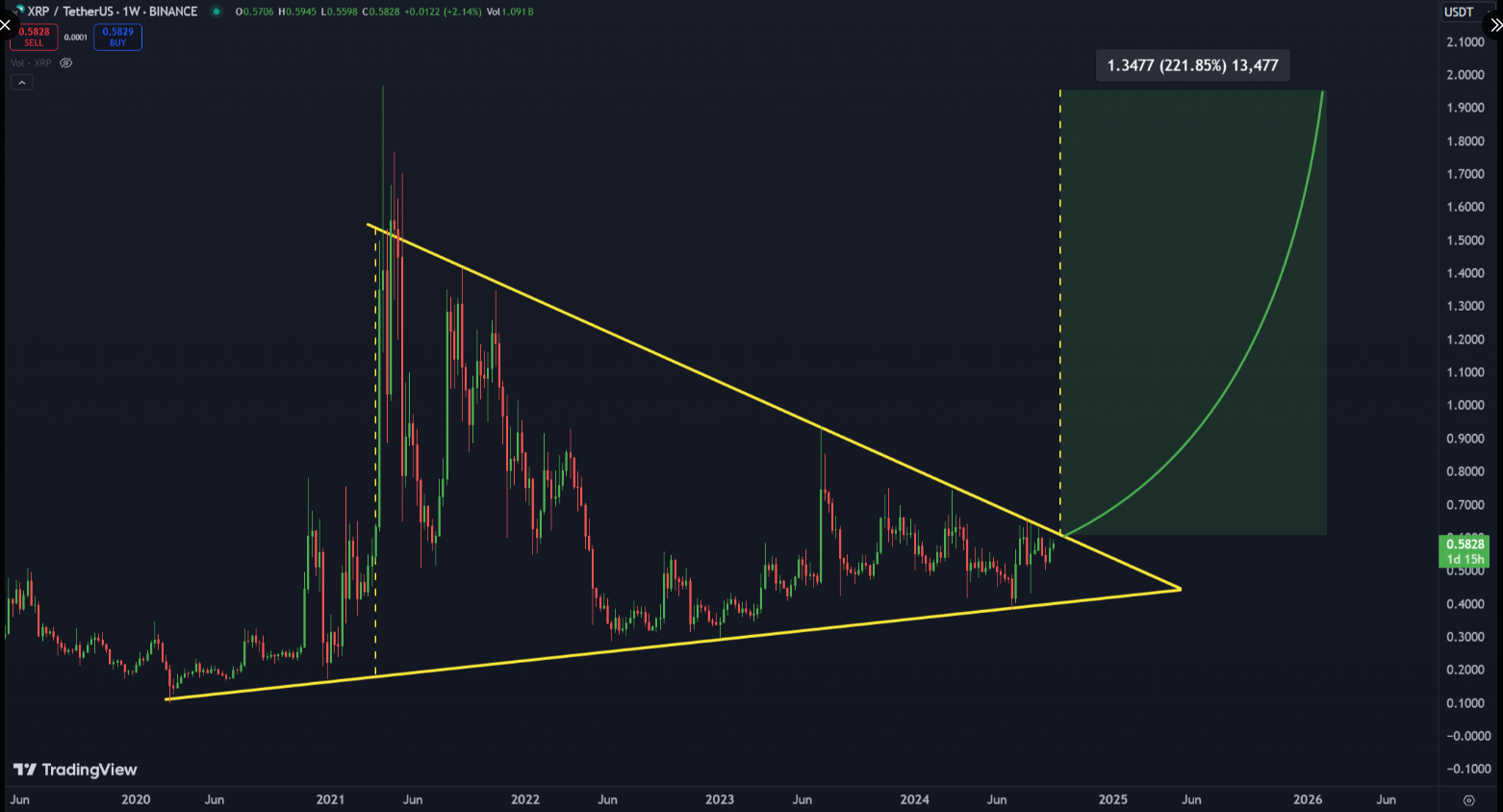 A menudo indicando un período de consolidación antes de un cambio importante, este arreglo técnico muestra líneas convergentes de soporte y resistencia. Según el estudio del trader, XRP podría explotar en un asombroso 221% si rompe por encima de la línea de resistencia superior, lo que quizás guíe el precio por encima de 1,34$.