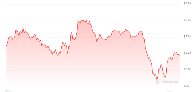 El precio de ETH todavía está por debajo de su máximo en enero de 2025, incluso con fuertes señales de adopción. ETH bajó 4.0% y 1.0% en los gráficos diarios y semanales a $3,203 al momento de escribir este artículo.