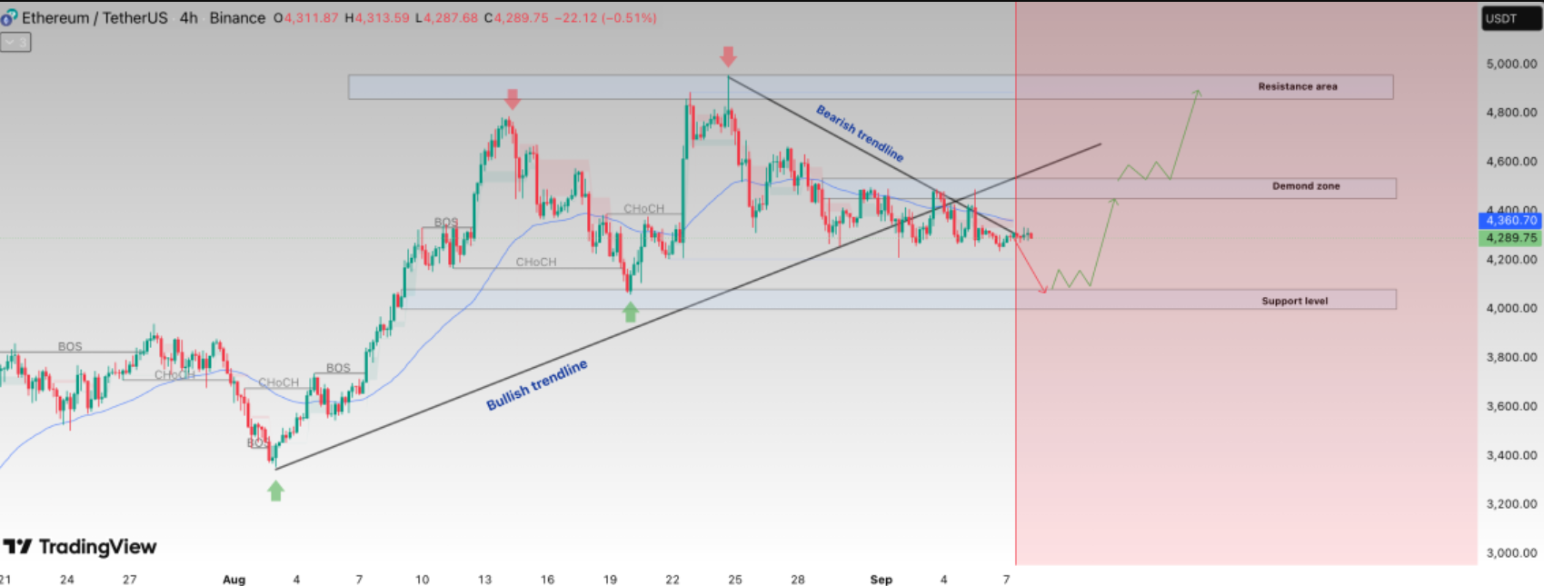 Hasta ahora, el precio de Ethereum se ha consolidado entre los 4.200 y los 4.300 dólares, después de encontrar una fuerte resistencia en el rango de 4.600-4.800 dólares el mes pasado. Esto ha llevado a un punto de inflexión que definirá la próxima dirección de la tendencia: alza o baja.