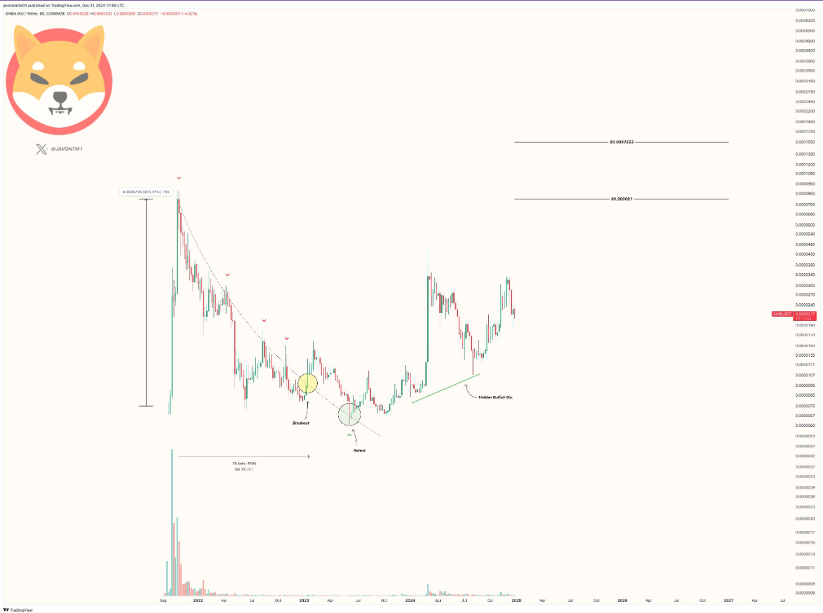 $SHIB (Shiba Inu) está terminando el año con una gran ruptura y saliendo de señales alcistas de libro de texto en marcos de tiempo más bajos.