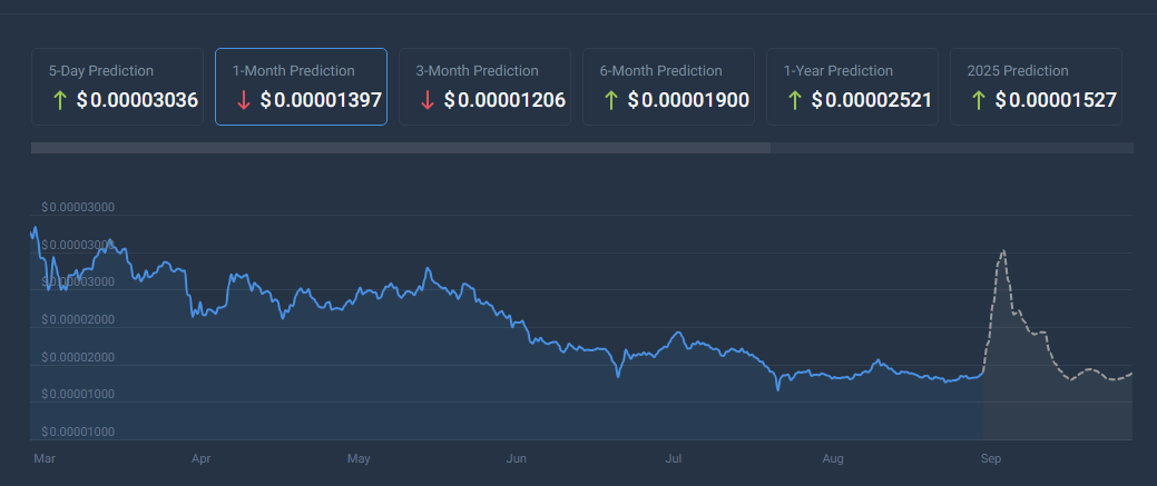 A diferencia de la esperanza a largo plazo de Krao, CoinCodex presenta una proyección de SHIB a corto plazo más cautelosa. Su estudio muestra que se espera que el precio disminuya gradualmente un 0,69%, alcanzando quizás 0,00001397 $ el 13 de octubre de 2024.