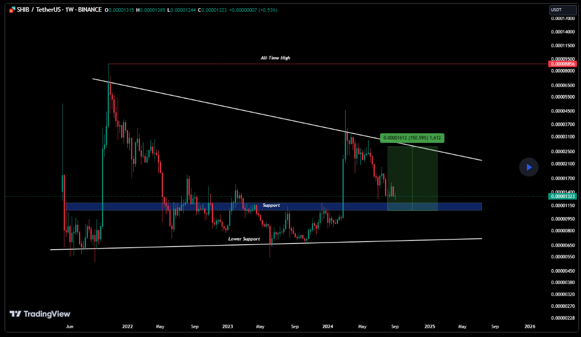 Su visión positiva se basa en un patrón técnico fundamental que se muestra en el gráfico mensual. SHIB se ha visto atrapado en una prolongada caída desde que alcanzó su máximo histórico en octubre de 2021 de 0,000088 $. Según Krao, una ruptura de esta formación de cuña descendente podría desencadenar un repunte importante e impulsar a SHIB hacia el cielo.