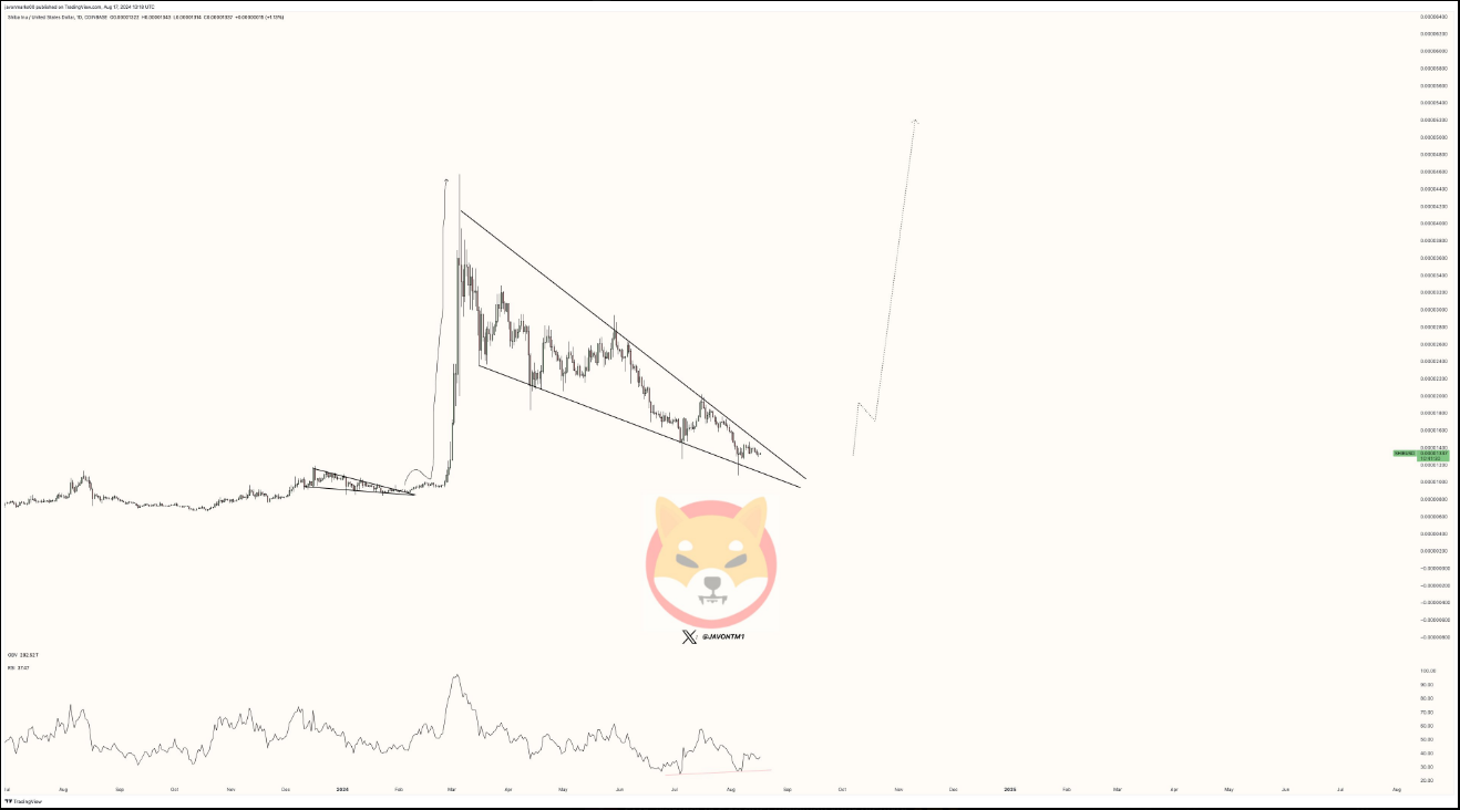 Marks es optimista debido a la formación de lo que se conoce como un patrón de cuña descendente, que generalmente se forma como una reversión alcista. Esta cuña ha estado surgiendo durante muchos meses, y SHIB ahora está llegando al punto en el que podría ocurrir una ruptura.