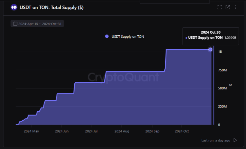 CryptoQuant añadió que TON solo tenía 130 millones de dólares en USDT en Mayo de 2024, pero después de medio año, la moneda estable se disparó a 1.020 millones de dólares.