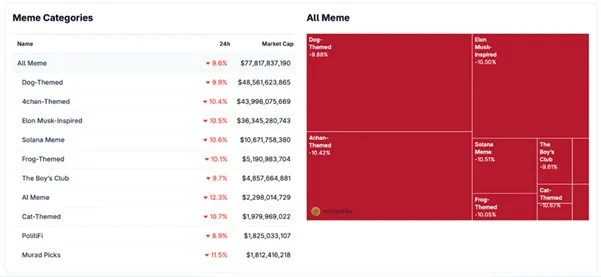 La capitalización de mercado total del sector de las meme coins ha caído por debajo de los 80.000 millones de dólares, después de haber rondado los 90.000 millones de dólares la semana anterior.