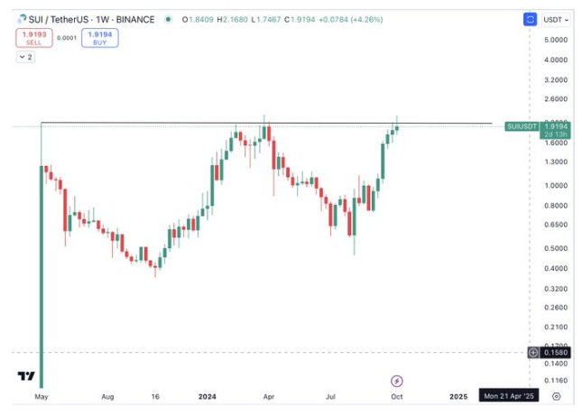 Un repunte a este rango de precios es significativo ya que marcará un nuevo máximo histórico (ATH)* para el precio de SUI, cuyo ATH actual es de 2,18$. Mientras tanto, el analista de criptomonedas The Cryptomist indicó que es probable que el cierre semanal de la moneda determine su próximo movimiento. Afirmó que una ruptura por encima de 1,91$ conduciría al descubrimiento de precios.