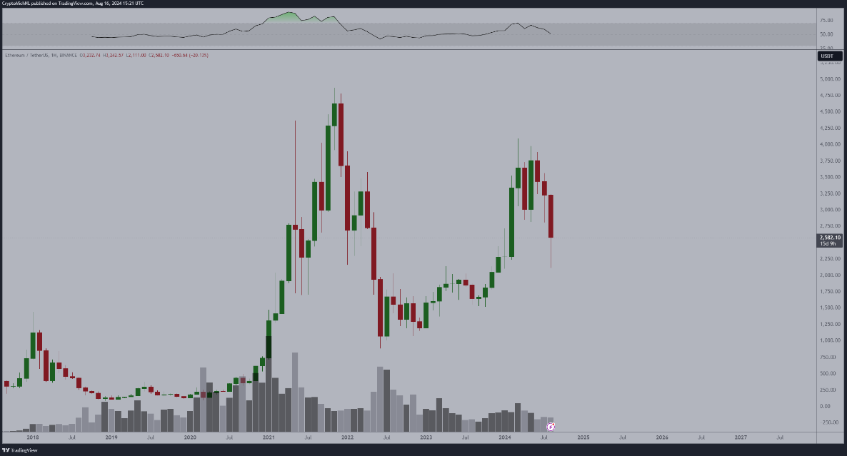 A pesar de esto, siente que hay un 80% de posibilidades de que ETH suba por encima de $3,000 en septiembre. Compara el mercado actual con los ciclos pasados, recordando que la última vez que la altcoin experimentó una pérdida prolongada fue antes del mercado bajista en 2018.