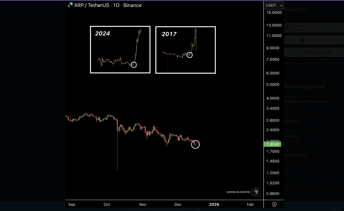 XRP se negocia alrededor de $1.87 y ha caído por debajo de la marca de $2 después de un reciente deslizamiento. Según los rastreadores del mercado, el token ha bajado alrededor del 30% en el cuarto trimestre de 2025, sin embargo, algunos analistas dicen que la debilidad actual puede ser parte de un mayor acumulado que ha precedido a fuertes rallies en el pasado.