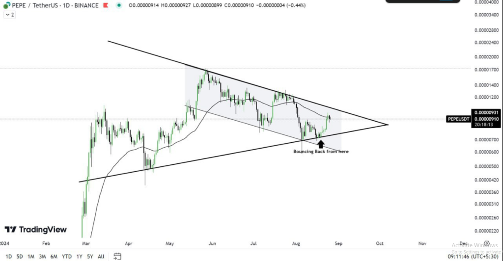 Generally, the breakout from a triangle’s upper trend line leads to large price increases. According to analysts, the price might likely record a significant gain that will send it to new all-time highs if PEPE manages to break beyond this level.