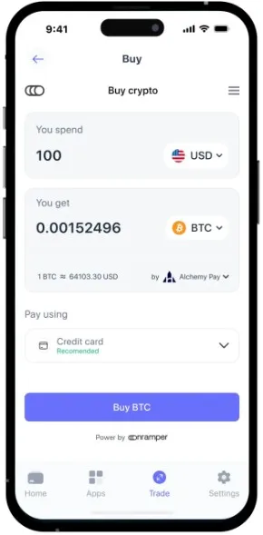 Ezt megteheted bankkártyával (Visa vagy Mastercard), Apple Pay vagy Google Pay használatával, illetve banki átutalással. Az alkalmazásban válaszd ki a „Fiat Deposit” vagy „Buy Crypto” opciót, majd add meg a kívánt összeget, és kövesd a fizetési instrukciókat.