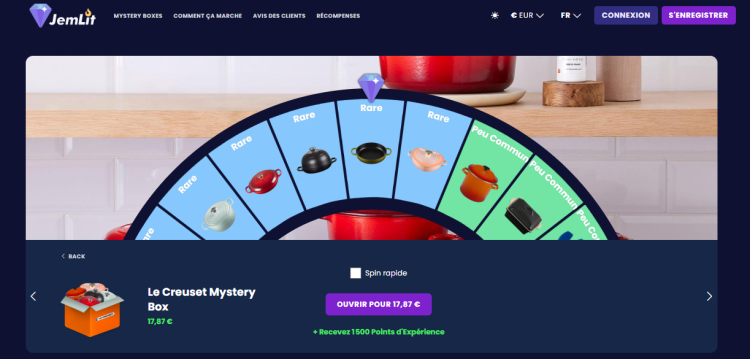 Jemlit est une plateforme novatrice qui propose des boîtes mystères numériques, incluant parfois des produits Le Creuset aux côtés d’articles haut de gamme d’autres marques avec des mystery box Apple, Samsung, Lego, Pokémon ou Nike.
