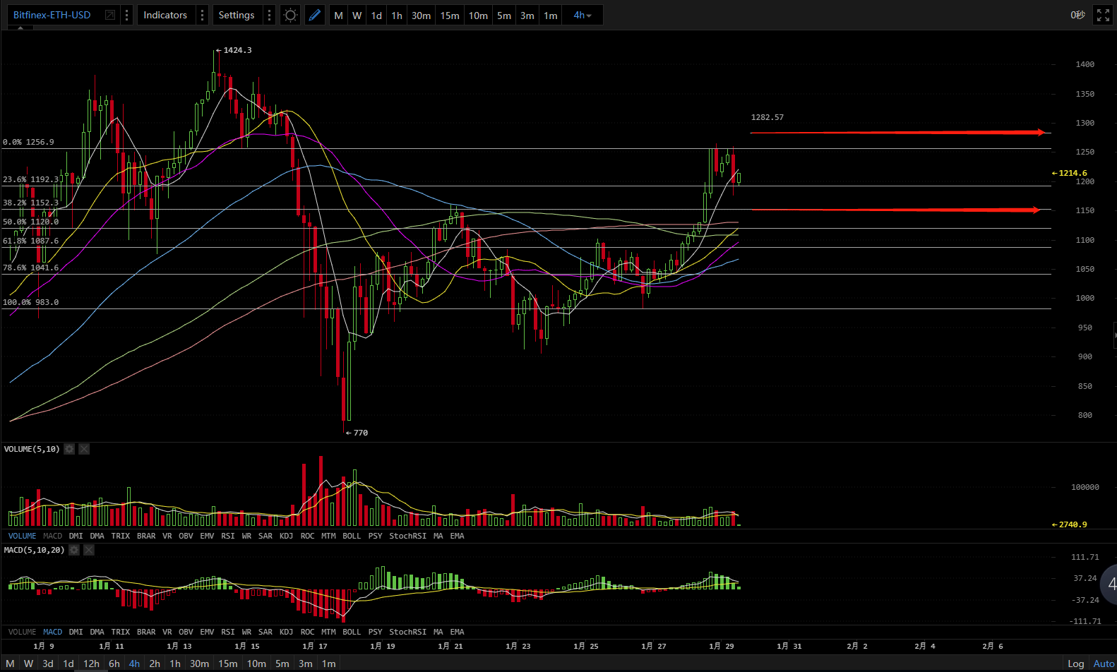 Price move reflects trend, which can be proved by the surge of ETH out of rigid demand yesterday. After reaching to the resistance as expected, price started a small-range correction and moved back to the 23.6% retracement level ($1,192.3) from $983 to $1,256.9. ETH still holds a chance to break upwards if BTC stabilizes its price move and tests upwards.