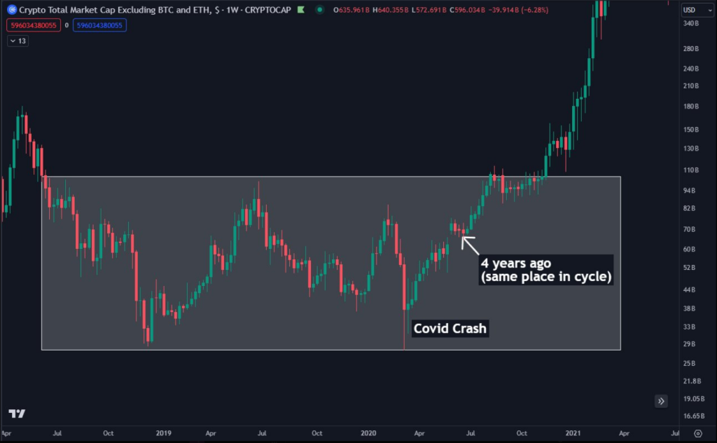 Looking beyond the immediate altcoin downturn, Daan Crypto draws parallels between the current market and the events of 2020. The analyst points to the strong performance of the market in 2023, particularly impressive for a year following a bear market. This mirrors the robust performance of late 2019, which preceded the 2020 crash.