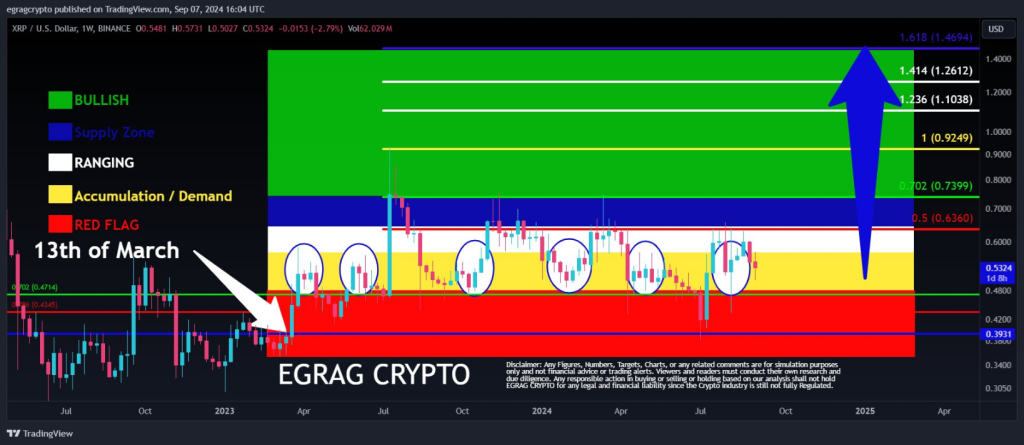 This particular movement of XRP has consolidated for over one and half years, which he thinks could be considered the accumulation that must be formed prior to a massive breakout. Egrag’s chart reveals that the bullish targets could be located at $0.739, $0.924, and may even be as high as $1.469.