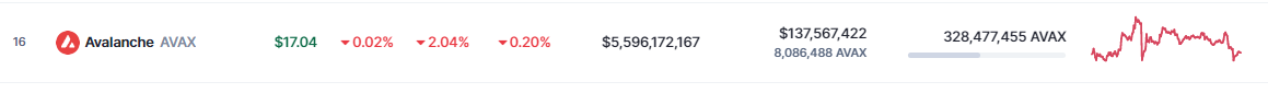 According to the latest CoinMarketCap data, Avalanche (AVAX) has experienced a minor 2.04% dip in its price over the last 24 hours, but still remains relatively steady at $17.04.