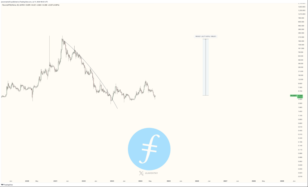 Popular analyst Javon Marks projects a significant 44X increase in Filecoin (FIL), therefore transforming the token from its present value of $4.40 to $190.
