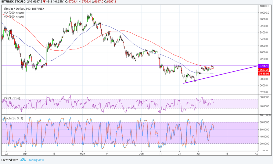 - Bitcoin price has formed higher lows and found resistance at the $6,785 level to create an ascending triangle.