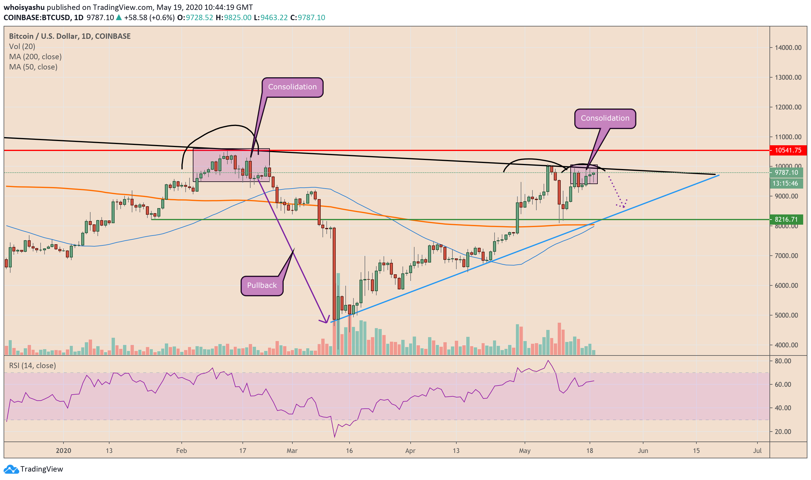 Each attempt to pierce above the $10,000-level met with two kinds of reaction: Consolidation and Pullback. The first reaction showed small traders waiting for big whales to make bold upside moves. But when no buying sentiment flourished, they sold the top to extract as much as profit as they could – leading to wild Pullback that sent the price lower.