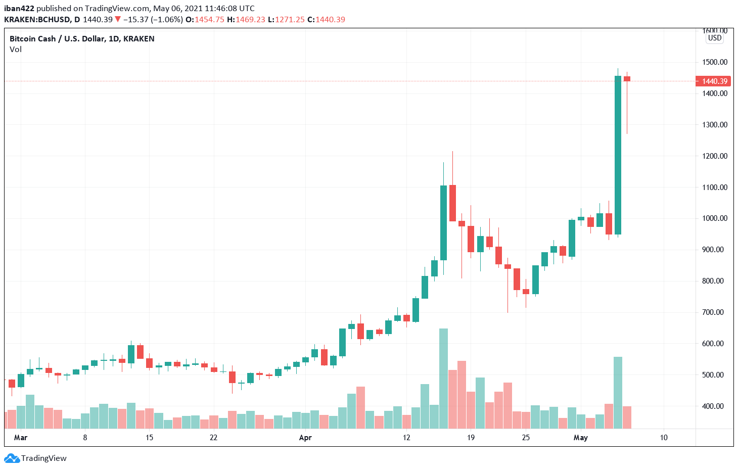 On Thursday, Bitcoin Cash (BCH) re-entered the top ten market capitalization rankings after a 36% overnight gain that compounded to 68% growth for the week. BCH’s per-coin value jumped from $1,068 to $1,462 in less than 24 hours leading up to Thursday, extending a significant rise from its weekly low in the $800 region.